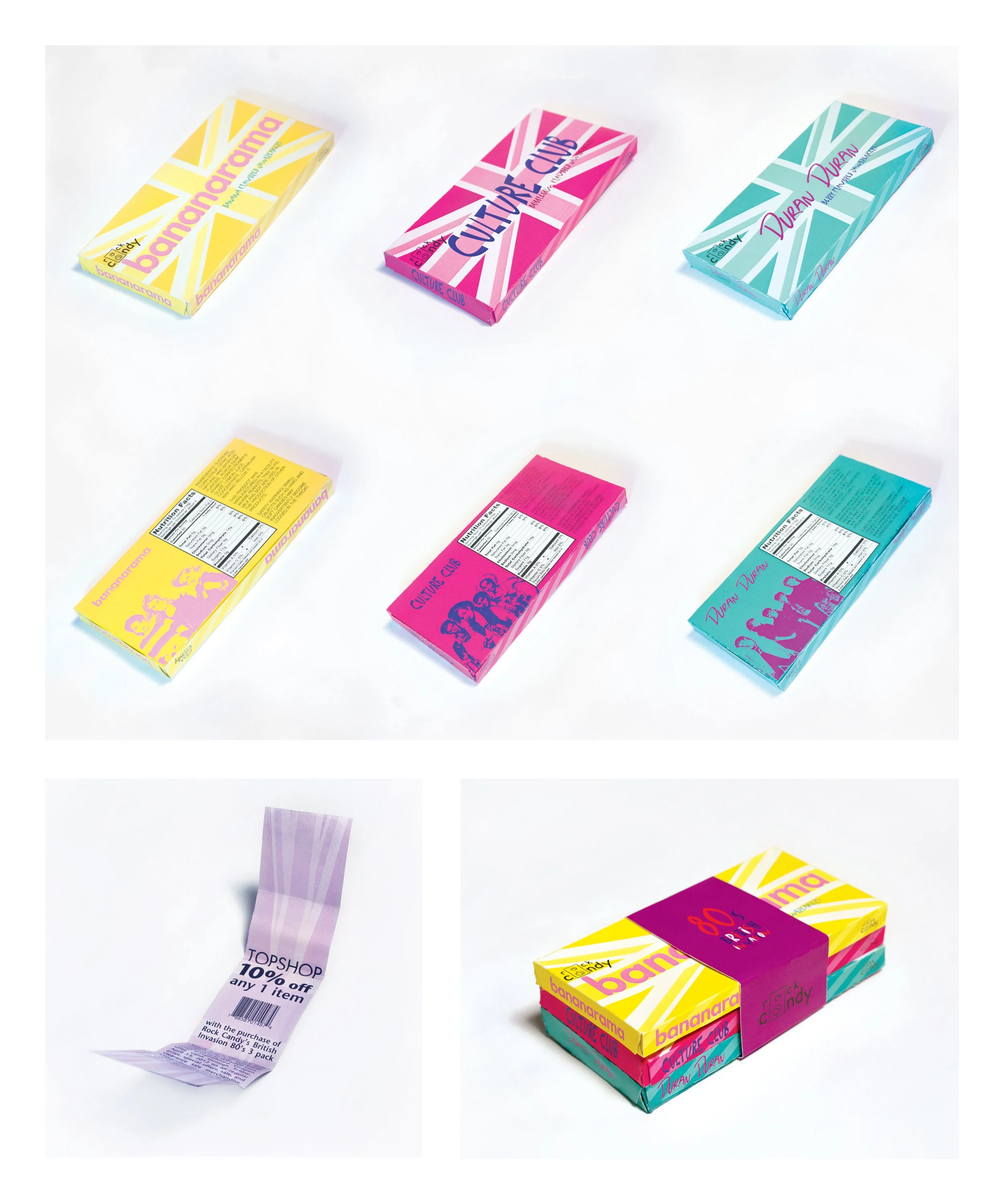 All of the below projects were designed as personal or school projects. The first is a design concept for a pack of candy themed to 80s British Invasion bands. Below that is an idea for a redesign and packaging of M&M candies.